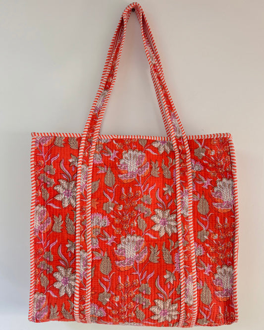 Orange with flowers l Big tote bag in quilted cotton