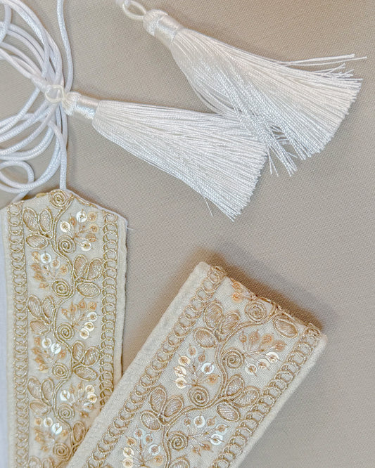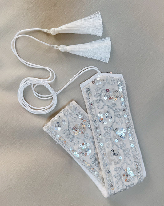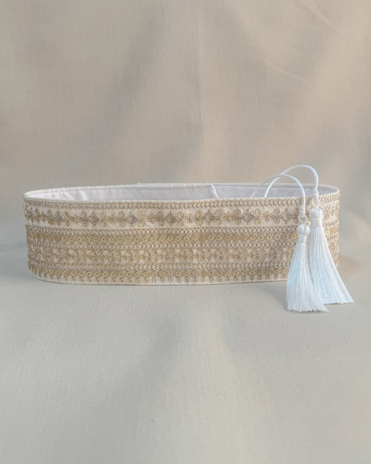 Off white bohemian embroidered obi belt with tassels