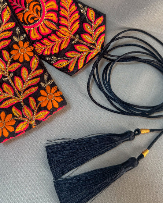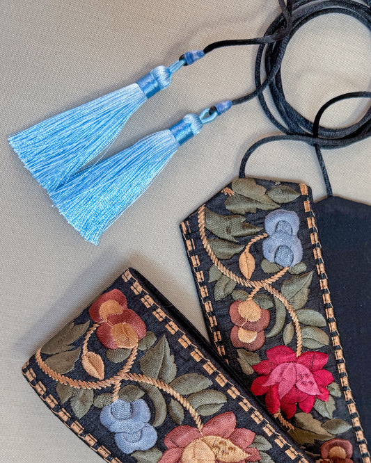 Bohemiam black belt with embroidered flowers and tassels