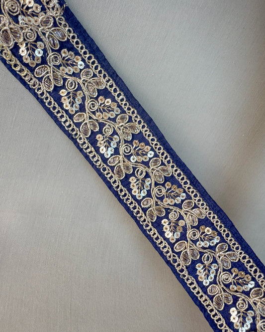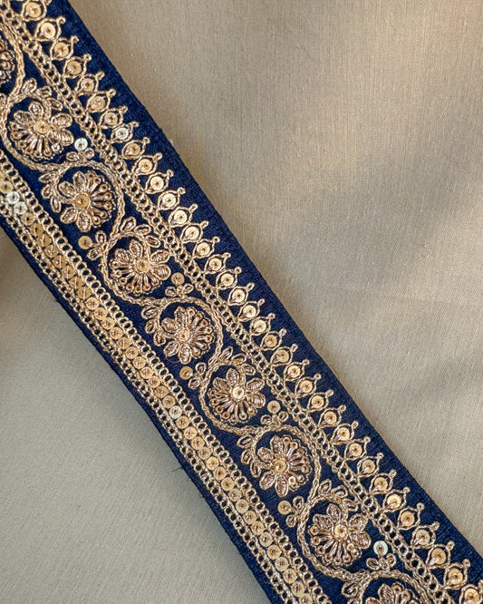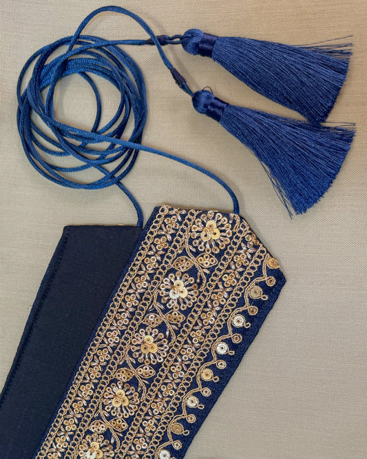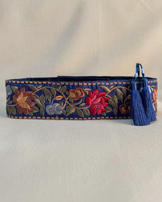 Dark blue bohemian embroidered obi belt with tassels