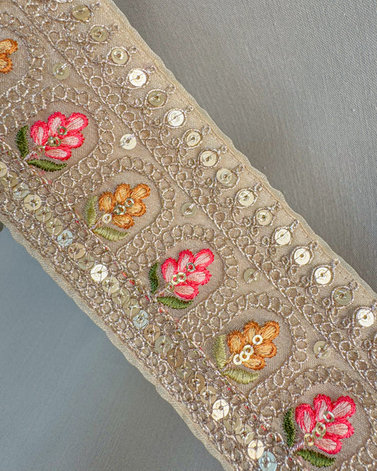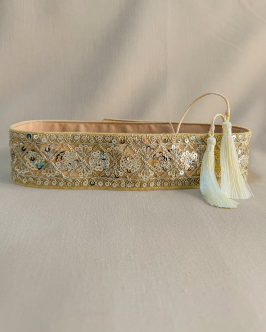 Beige bohemian embroidered obi belt with tassels