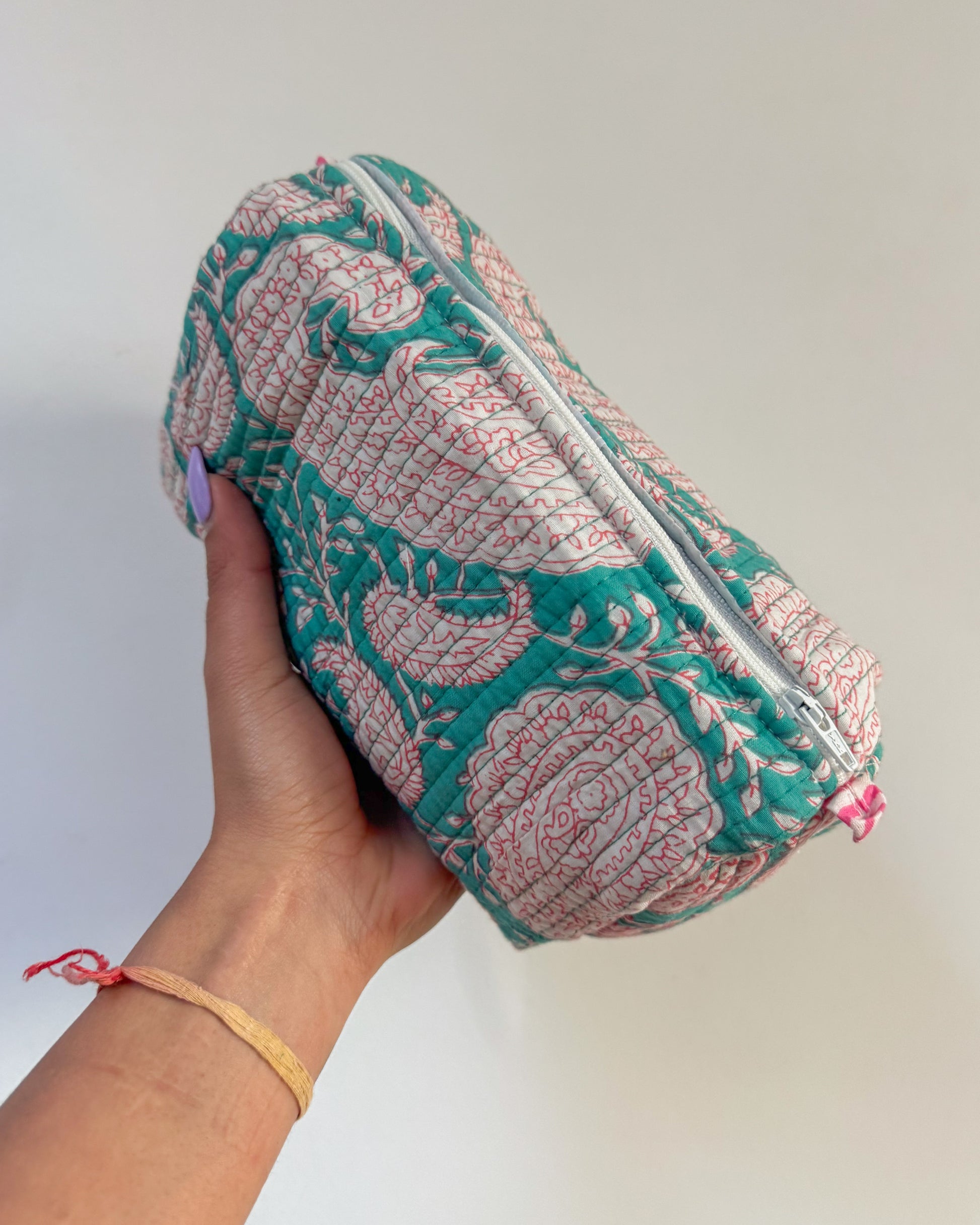 This isn’t just a pouch—it’s your travel buddy, your everyday catch-all, the one you’ll throw in your bag and wonder how you ever lived without it. Made with soft quilted cotton that feels cozy but still holds its shape.
