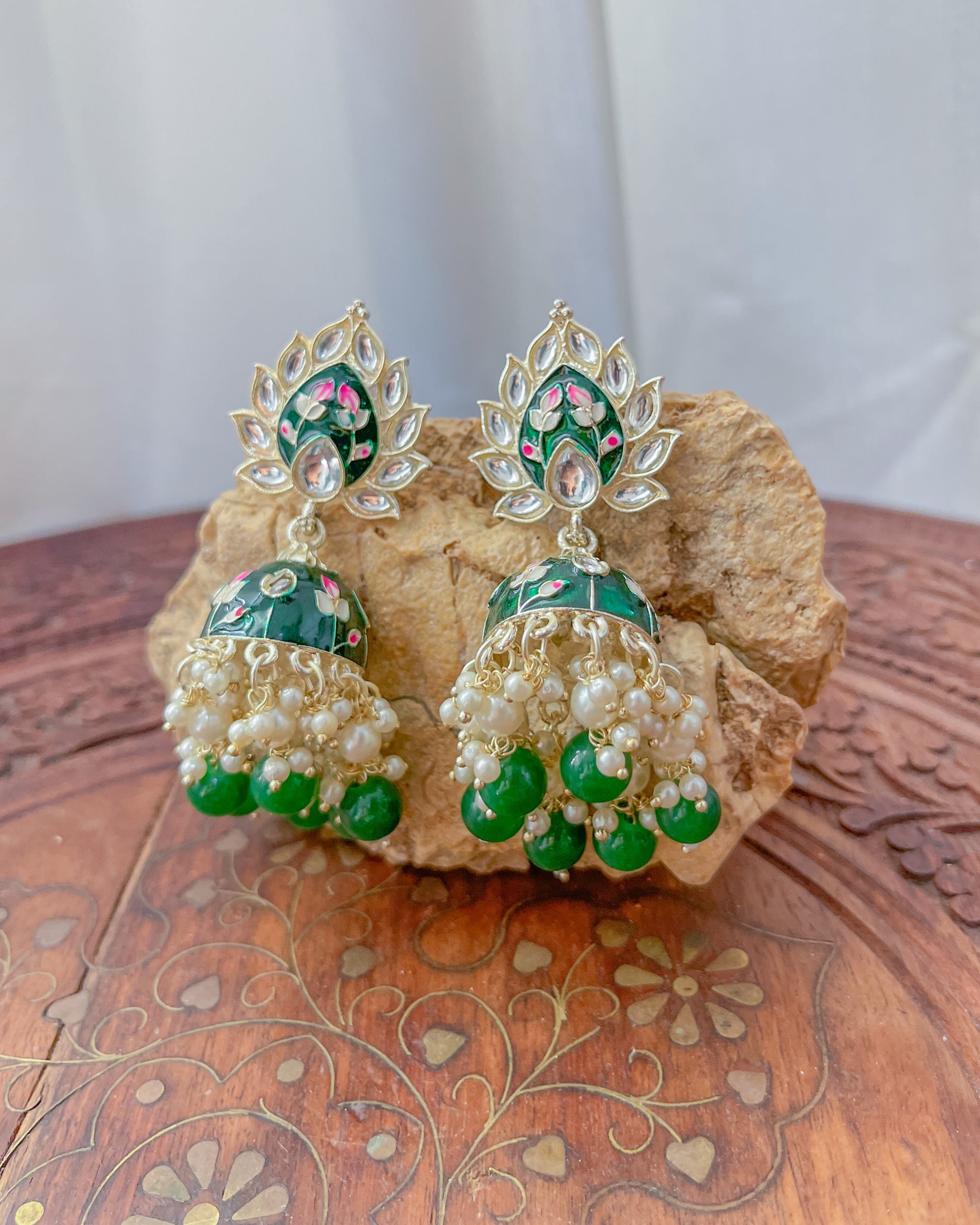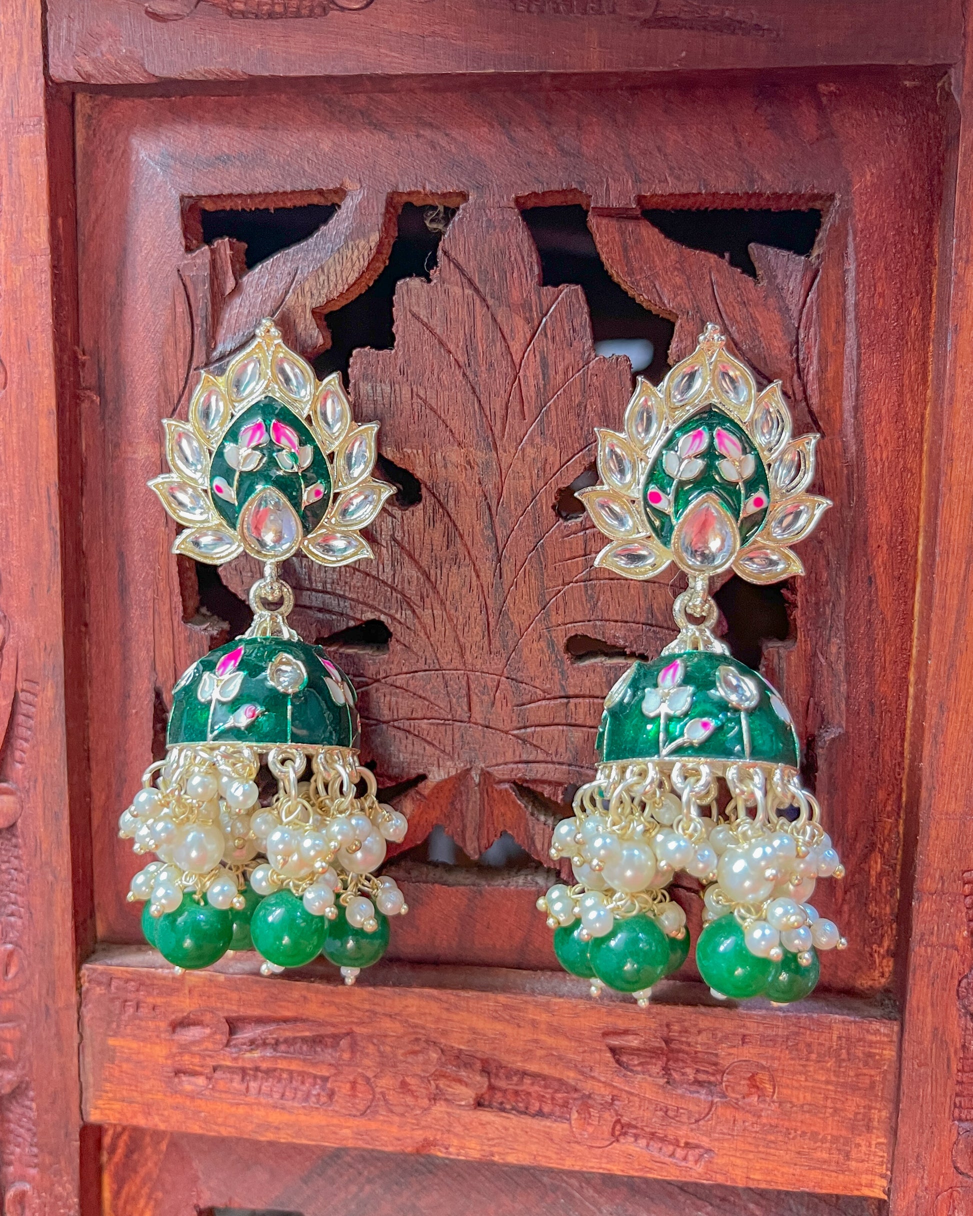 These bold golden earrings are made to stand out. Inspired by traditional jewelry worn across India. They feature delicate hand-painted enamel flowers for a unique and artsy finish.